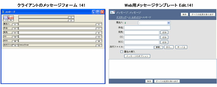 グがテンプレートのフィールドのプレースホルダとして機能します。このX-FCタグがクライアント用フォームのフィールドに直接マッピングされ、FirstClassサーバから該当する同じデータが取り出されます。クライアント用フォーム上の各フィールドは、Webテンプレート上の同じフィールドに対応します。下図は、クライアント用の[メッセージ]フォームとそれに対応するWeb用のフォームです。
