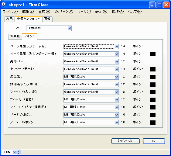 Webページの色とフォントは、[.sitepref(サイトの基本設定)]フォームの[背景色とフォント]タブで設定できます。自分で色とフォントを設定するか、あらかじめ色とフォントの組み合わせが決められたテーマを選択できます。