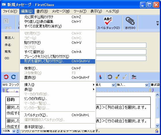リッチテキスト形式(.rtf)に対応している外部アプリケーションかFirstClassから表をコピーすると、自動的にFirstClassの本文に表として貼り付けられます。
