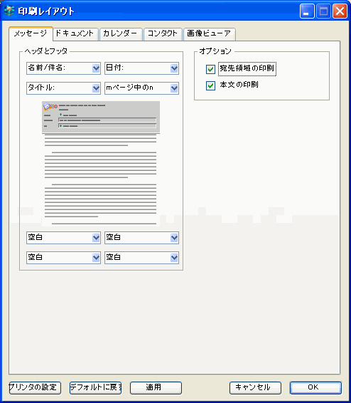 メッセージ、ドキュメントおよびカレンダーでは、印刷する情報を指定できます。また、情報の表示方法も指定できるほか、コンタクトとメールリストでは印刷レイアウトも設定できます。