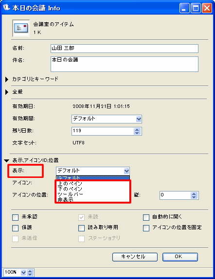 メインペインが2つに分かれて表示されている場合は、メッセージやドキュメントなどのFirstClassオブジェクトは下のペインに表示されます。コンテナは上のペインに表示されます。オブジェクトの位置を変更するには、オブジェクトのプロパティを更新してください。また、オブジェクトをドラッグして別のペインに移動することもできます。