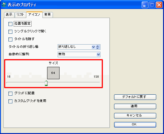[アイコン]タブの[アイコンのサイズ]で、アイコンが目的のサイズになるまでスライダを動かしてください。