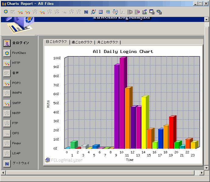 日ごと、週ごと、および月ごとのログインアクティビティ情報をログインプロトコル別にグラフ化できます。グラフを表示するには、以下の手順に従ってください。