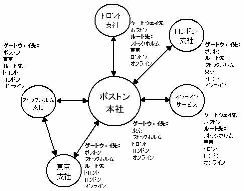 マルチサイトメールのネットワークでは、ユーザは、メールの宛先にゲートウェイを指定するのと同じ要領で、メールの宛先ルートを指定できます。例えば、トロント支社のユーザが東京支社のユーザにメールを送信するとします。トロント支社のサーバは、そのメッセージをボストン本社のゲートウェイに送信し、ボストン本社がそのメッセージを東京支社に送信します。