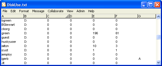 - [ユーザ情報]フォームで[副管理者]権限を有効にする方法で登録した副管理者を検索するには、DiskUseテキストをご覧ください([Reports]フォルダをダブルクリックして[Statistics Folder]を開き、DiskUse.txtを選択してください)。副管理者は右端のフィールドに「A」の文字が含まれています(このテキストでは、[ユーザ情報]フォームで[副管理者]権限を与えられたユーザはわかりますが、[グループ権限]フォームで副管理者権限を与えられたユーザはわかりません)。