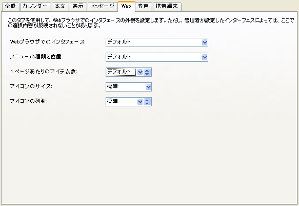このタブを使用して、Webブラウザで接続した場合のFirstClassの表示方法を設定します。管理者がWebブラウザによるサーバへのアクセスを許可していない場合、この設定は無効です。
