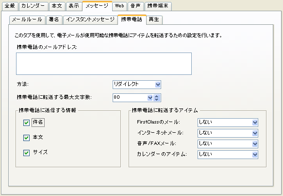 転送先の携帯電話で表示可能な最大文字数です。 FirstClassは、ここで設定した文字数までのメッセージを転送またはリダイレクトします。 |