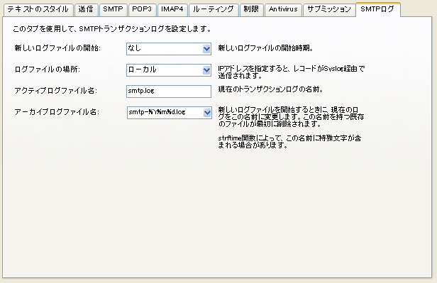 ログファイルが保存されて新しいログファイルが開始されると、その保存された過去のログファイルの名前が変更されます。この名前には、strttime関数によって特殊文字が挿入されます。新しいログファイルは毎回この名前で保存され、以前に保存されていたファイルはそのたびに上書きされます。デフォルト:smtp-%Y%m%d.log |