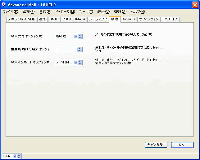 受信メールを配信するために使用できるセッション数を制限します。デフォルト:無制限 |
