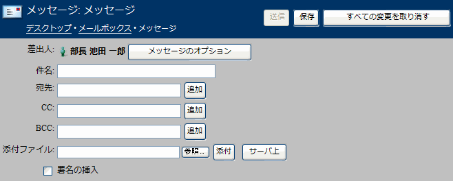 インターネット経由でメッセージを送信する場合は、名前の横にあるフィールドからインターネットメールアドレスを選択して、差出人としてメッセージに表示できます。インターネット経由でこのメールを受信した相手には、FirstClassのユーザ名は表示されず、インターネットメールアドレスだけが表示されます。