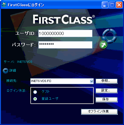 インターネットサービスをインストールすると、Inetsvcs.fcという名前の接続設定ファイルが、インターネットサービスの実行ファイルと同じフォルダ内に作成されます。インターネットサービスのユーザアカウントにログインするには、このファイルを使用します。このファイルをダブルクリックすると、ログイン画面が表示されます。