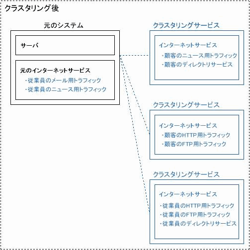 プロトコルとドメインを組み合わせてインターネットサービスをクラスタ化できます。以下の例では、従業員と顧客が利用するHTTPサービスFTPサービス、およびメールサービスとニュースサービス(SMTPとNNTP)分離することにしました。合計で4台インターネットサービス用マシンを使用して、ドメインとプロトコルを組み合わせたクラスタを設定します。