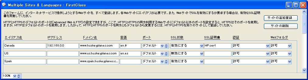 下図は、このサイト構成時の[複数サイトと複数言語の設定]フォームです。