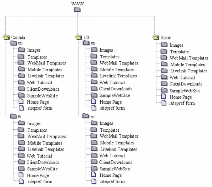 上の例では、この企業はCanada(カナダ)、US(米国)、およびSpain(スペイン)という3つの異なるサイトを作成しており、どのサイトも同じサーバマシンに割り当てられています。CanadaとUSは、それぞれ対応する2種類の言語用フォルダを持っています。各コンテナには、それぞれの言語で記述されたホームページ(トップページ)があります。この会社のサイト管理者は、[FC Resource