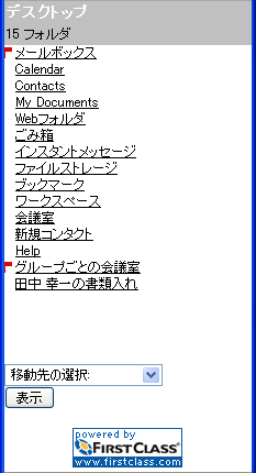 [モバイル]インタフェースは、ユーザが携帯端末でログインした場合に表示されるインタフェースです。このWebクライアントは簡易なHTMLで記述されており、複雑なグラフィカルインタフェースを利用しないで、リンクとテキストを中心に表示するように作られています。