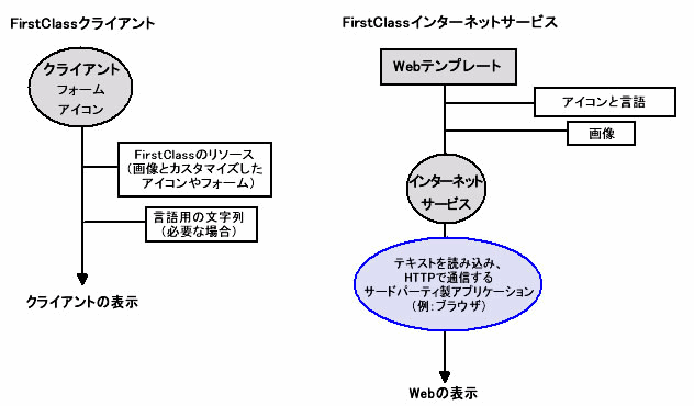 下図は、FirstClassクライアントがフォームとリソースを出力する方法と、インターネットサービスがテンプレートとリソースを出力する方法を表したものです。