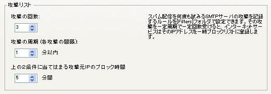 インターネットサービスには「攻撃リスト」機能があり、(管理者デスクトップの[Filters]フォルダ内にある)rules.MailRulesドキュメントに次のような記述を追加することで、不必要な接続を行うIPアドレスを一時的にブロックできます。