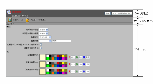 [背景色]タブの設定は、標準のWebクライアントインタフェースでは下図に示した場所に適用されます。
