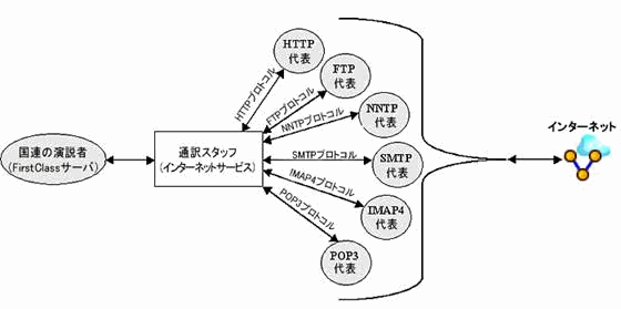 インターネットサービスの役割をたとえ話で説明しましょう。FirstClassのシステムを国際連合(国連)での会議にたとえると、インターネットサービスは国連の通訳チームとみなすことができます。FirstClassサーバは、演壇に立ち、さまざまな言語を話す各国代表者たちに対してある言語で演説している国連の演説者にたとえられます。この演説は、各国の代表者が理解できるようにさまざまな言語に通訳される必要があります。逆に、各国代表者が質問をする場合は、彼らの言語を演説者が理解できる言語に通訳する必要があります。この通訳をインターネットサービスが行います。以下の図は、この関係を表し