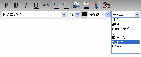 水平線を挿入するには、[挿入]>[水平線]を選択してください。水平線は現在のカーソル位置の下に描画され、カーソルおよびそれに続く本文は線の下に移動します。