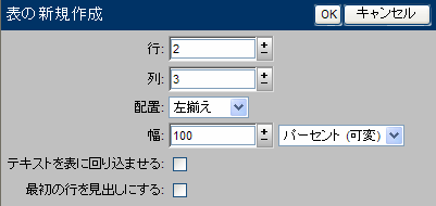 2番目のフィールドで、この幅をページ幅(左マージンから右マージンまでの幅)に対する割合(%)で指定するか、または絶対値(ピクセル)で指定するかを選択してください。割合を指定した場合、ウィンドウのサイズが変わるたびに表のサイズも変わります。