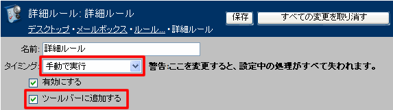 コンテナのツールバーにルールを設定すると、そのコンテナ内でメールを選択し、ツールバーボタンをクリックすることで、選択したメールに対してルールを実行できるようになります。この設定によって、以下の動作が可能になります。