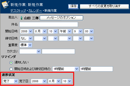 作業の進捗状況を変更するには、作業のフォームの[進捗状況]で適切な状況を選択してください。