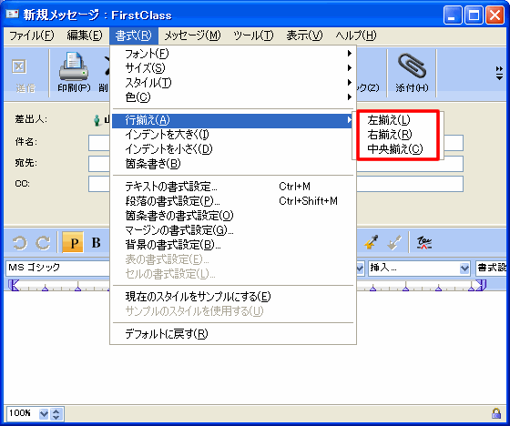 •     [書式]>[行揃え]を選択して、適用する行揃えを選択する