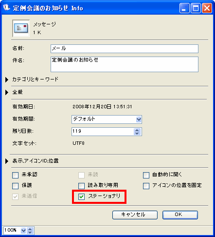4 このメッセージのプロパティを開いて、もう一度[ステーショナリ]を選択します。