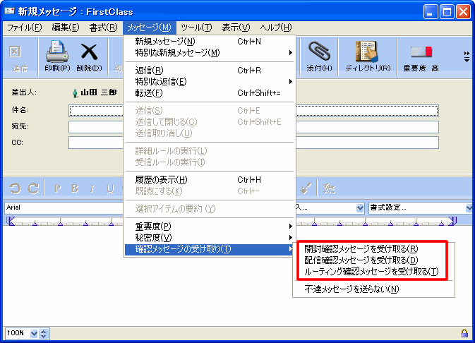[メッセージ]>[確認メッセージの受け取り]>[開封確認メッセージを受け取る] |