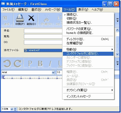 メッセージに添付された.vcfファイルをインポートするには、そのファイルを選択して、[ツール]>[コンタクトに追加]を選択します。コンタクトが[コンタクト]フォルダ内に作成されます。
