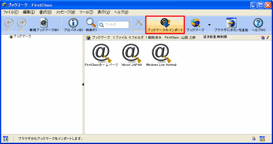 WebブラウザからFirstClassの[ブックマーク]フォルダにブックマーク(お気に入り)をインポートするには、次の2つの方法があります。