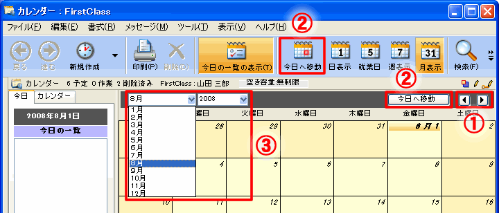 カレンダー上の[今日へ移動]ボタンをクリックするか、ツールバーの[今日へ移動]をクリックして、現在の月、週、または日に戻ることができます。(②)