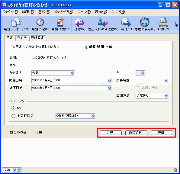 応答ボタン([了解][仮に了解][辞退])で前とは異なる返事をすることもできます。他のユーザには、新しい応答に対応したアイコンが応答者の名前の横に表示されます。