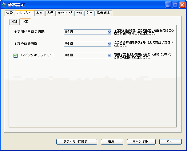 作成するすべての予定と作業、およびユーザが招待されている予定に対してデフォルトのリマインダ時間を指定するには、[基本設定]の[カレンダー]タブで[リマインダのデフォルト]を選択し、時間を選択または入力してください。