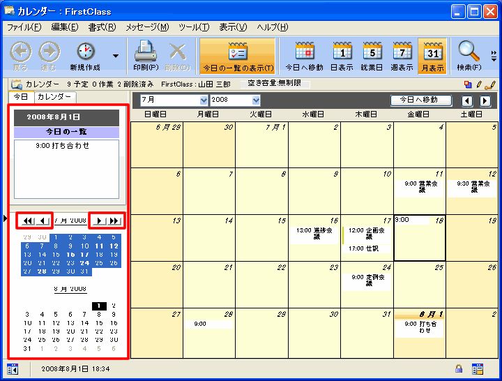 左のペインに[今日の一覧]と小さな月間カレンダーペインを表示している場合、小さな月間カレンダーで日付を選択すると、それに応じて右のペインの表示が変更されます。