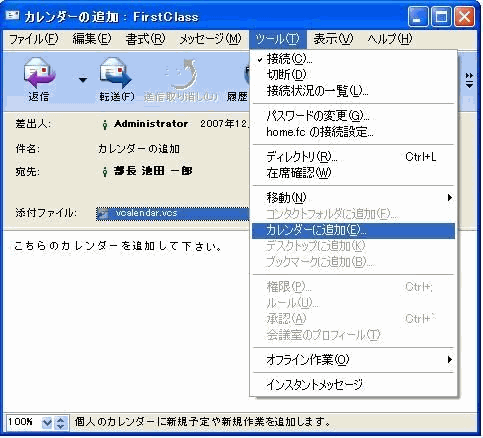メッセージに添付されたファイルをインポートするには、そのファイルを選択して、[ツール]>[カレンダーに追加]を選択します。