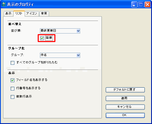 また、[表示のプロパティ]フォームの[並べ替え]タブで[降順]を選択して、昇順と降順を切り替えることもできます。