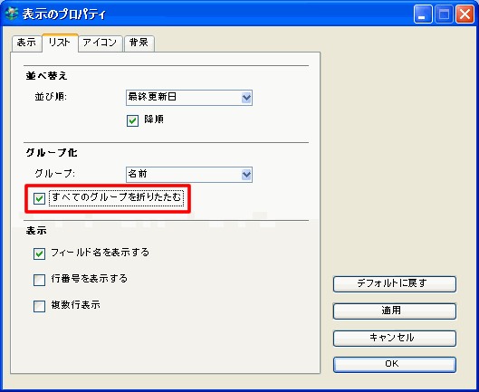 グループ化を表す列の見出しをクリックします。 または [表示のプロパティ]フォームの[詳細表示のプロパティ]セクションで[すべてのグループを折りたたむ]を使用します。 |