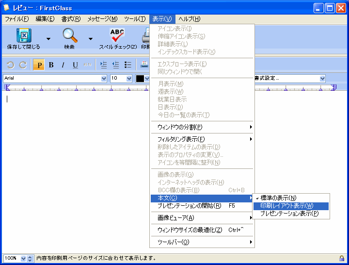 複数のページを印刷する場合、対象となる印刷ページを決めるには、[表示]>[本文]>[印刷レイアウト表示]を選択してください。ステータスバーにページ番号が表示されます。