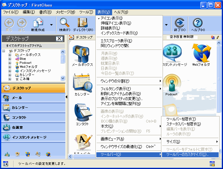1       [表示]>[ツールバー]>[ツールバーのカスタマイズ]を選択します。