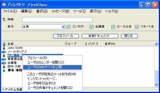他のローカルユーザのWebサイトを開くには、ディレクトリ、[在席確認]リスト、メッセージの宛先領域、または[インスタントメッセージ]フォームでコンテキストメニューを開いて、[ユーザのWebサイトを公開]をクリックしてください。