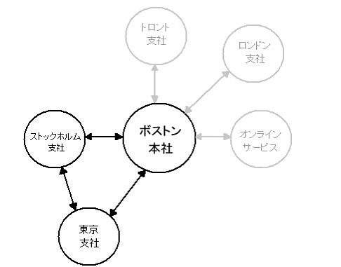 ストックホルム支社のサーバとボストン本社のサーバには互いを直接結ぶゲートウェイがありますが、この2つのサーバのディレクトリは東京支社のサーバ経由で複製されるため、複製ループは起こりません。