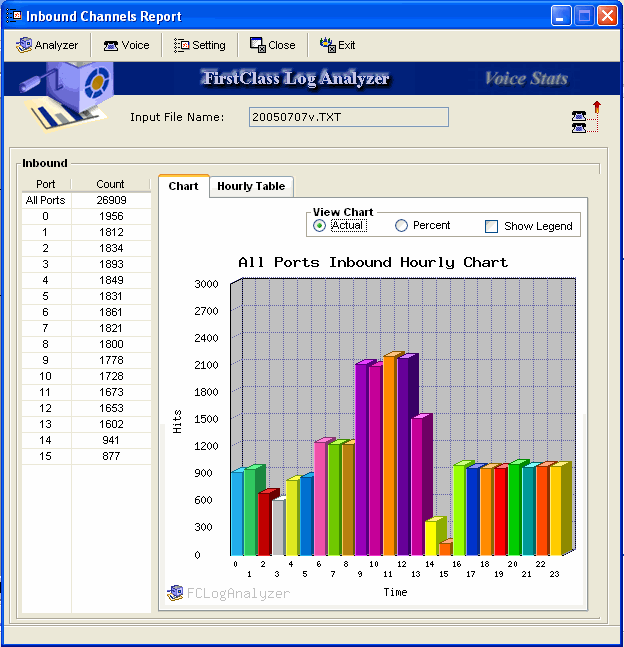 Summary chart of the number of hourly inbound calls. • To view the chart with the actual data, select Actual. • To view the chart with proportional data, select Percentage. • To show the chart legend, select Show Legend. |