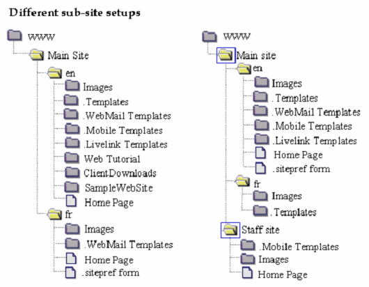 上の例では、この企業はCanada(カナダ)、US(米国)、およびSpain(スペイン)という3つの異なるサイトを作成しており、どのサイトも同じサーバマシンに割り当てられています。CanadaとUSは、それぞれ対応する2種類の言語用フォルダを持っています。各コンテナには、それぞれの言語で記述されたホームページ(トップページ)があります。この会社のサイト管理者は、[FC Resource
