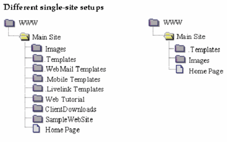 どのようなサイトを作る場合でも、基本的なサイト構成は同じです。必要となるオブジェクトは、テンプレートセット、[Images]フォルダ、および[Home Page]ドキュメントだけです。下図は、FirstClassで複数のWebサイトを構成する場合の例です。ただし、ご利用のニーズに合わせて様々なサイト構成が可能です。