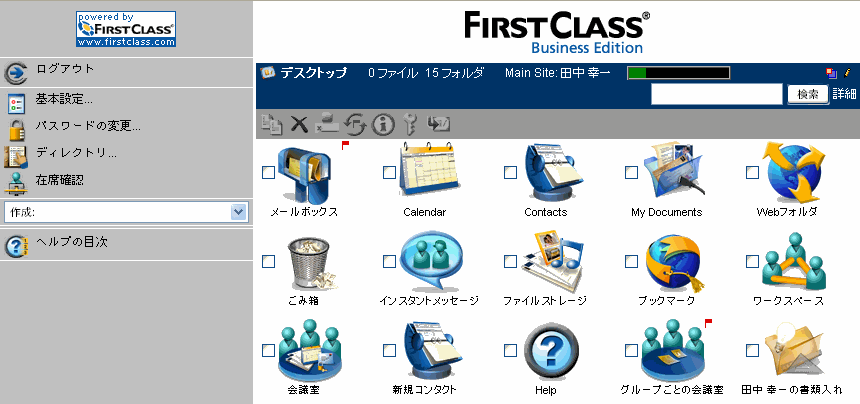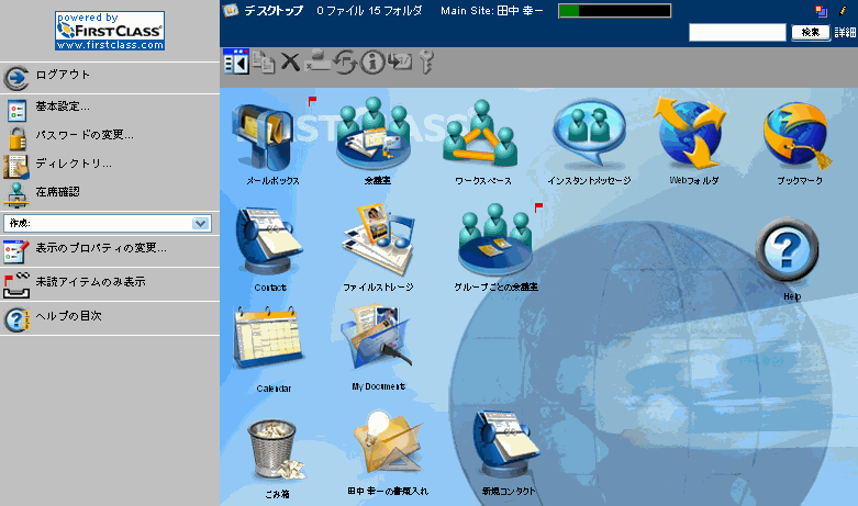 デフォルトでは、FirstClassは標準のWebインタフェースを表示します。ただし、管理者が標準以外のテンプレートを設定した場合は異なるインタフェースとなります(「テンプレートセットの選択を参照)。標準インタフェースには[クラシック]と[拡張]の2種類があり、[.sitepref(サイトの基本設定)]フォーム[表示]タブで設定できます。