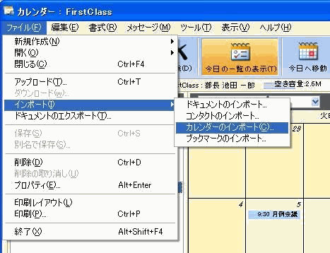 1 [ファイル]>[インポート]>[カレンダーのインポート]を選択します。