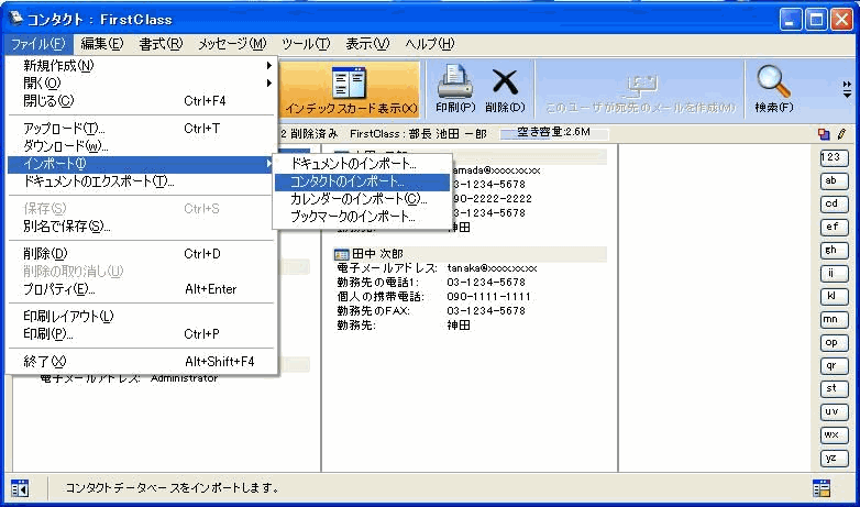 3 [ファイル]>[インポート]>[コンタクトのインポート]を選択します。