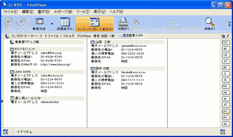 特定の文字で始まるコンタクトの先頭のコンタクトを表示するには、コンタクトデータベースのウィンドウの右側にある適切なボタンをクリックしてください。
